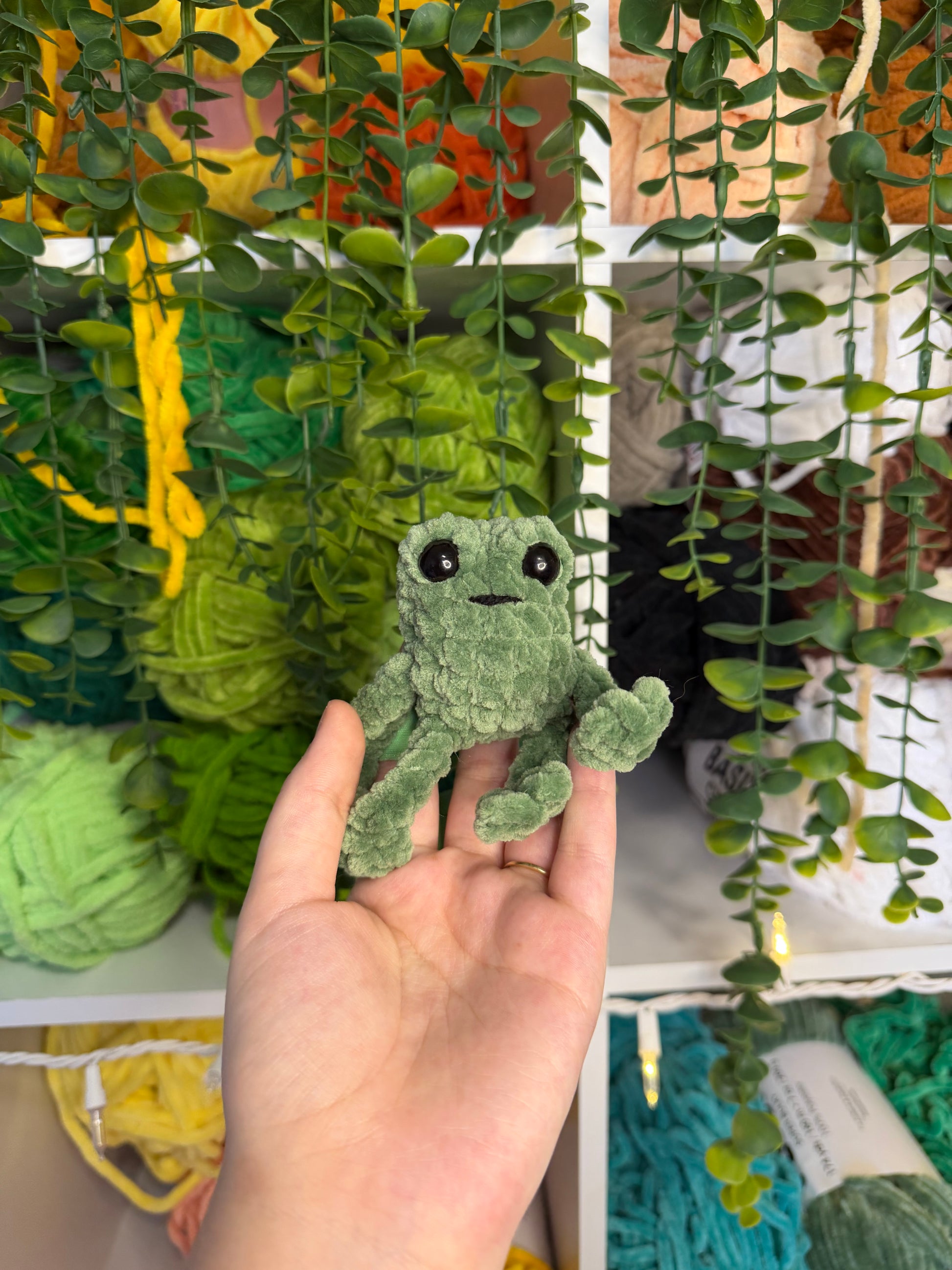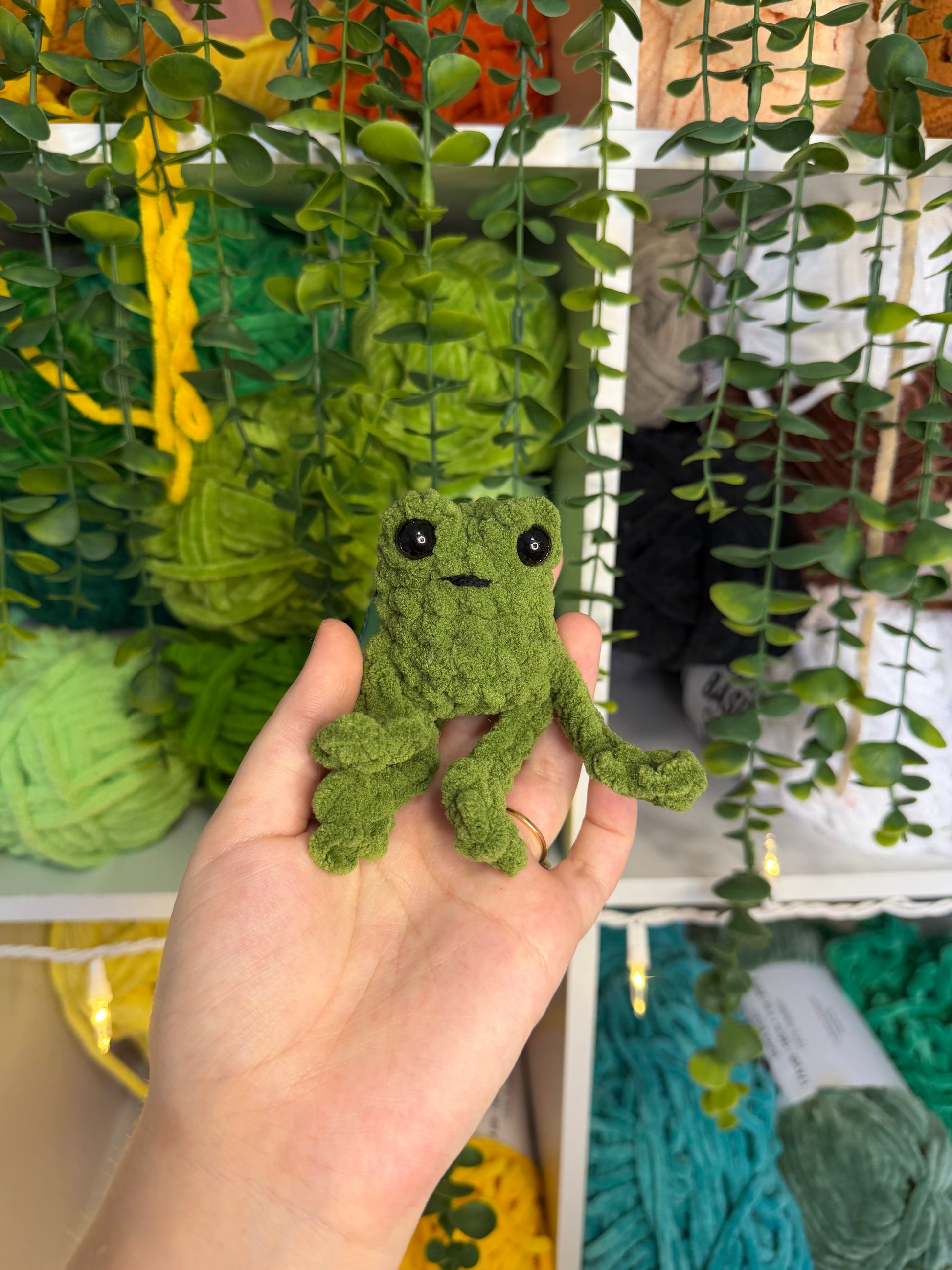 Crocheted baby leggy frogs. Handmade with yarn, stuffing, and safety eyes. About 4.5 inches long.
