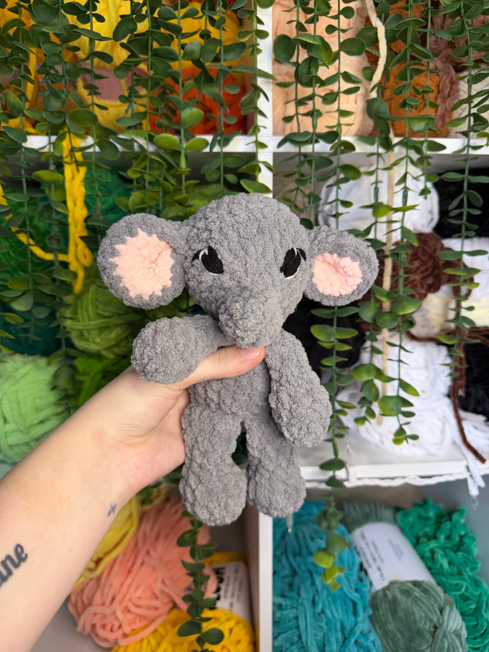 Crocheted baby safe elephant. Handmade with yarn, stuffing, and safety eyes. About 8.5 inches tall.