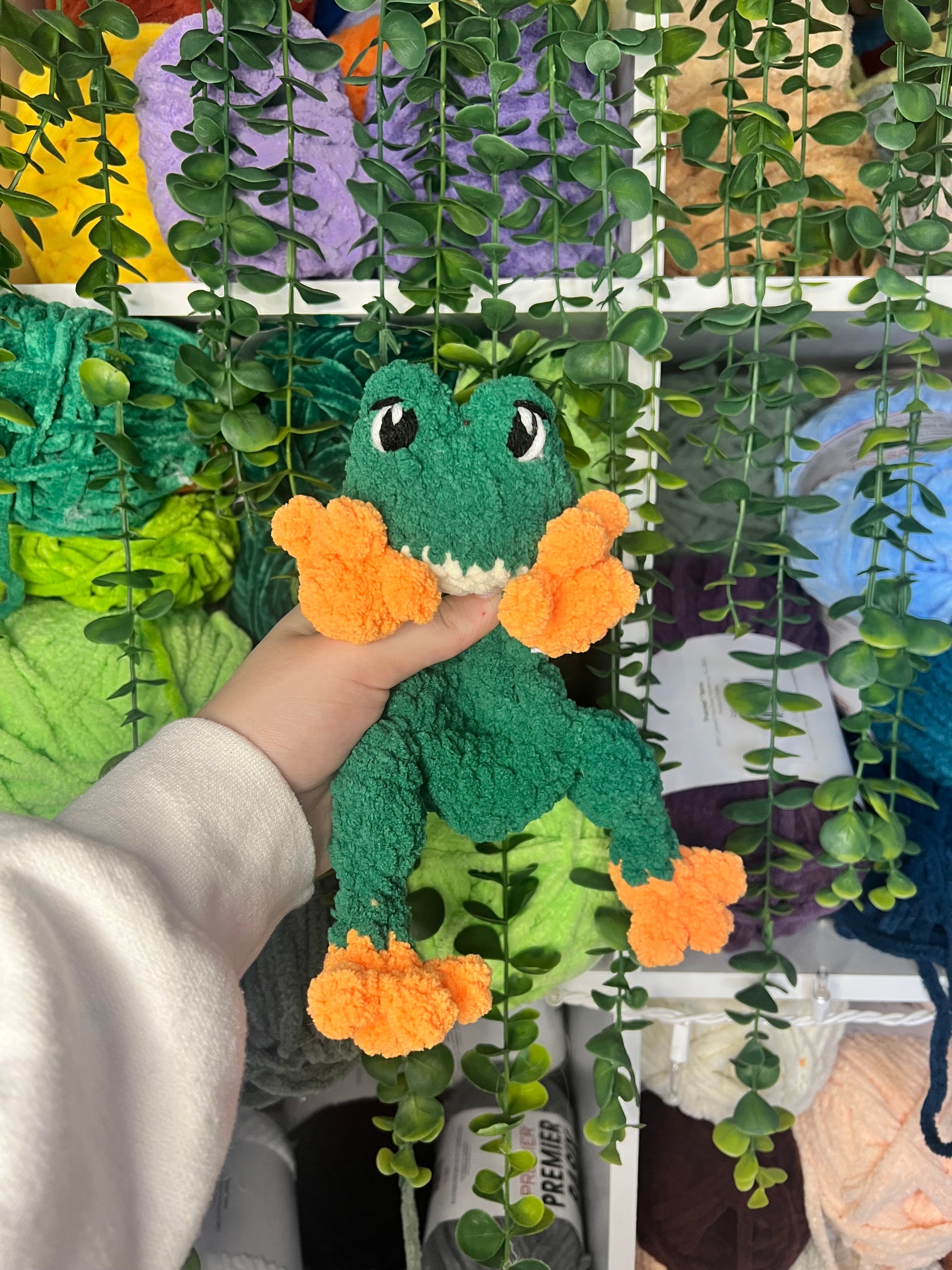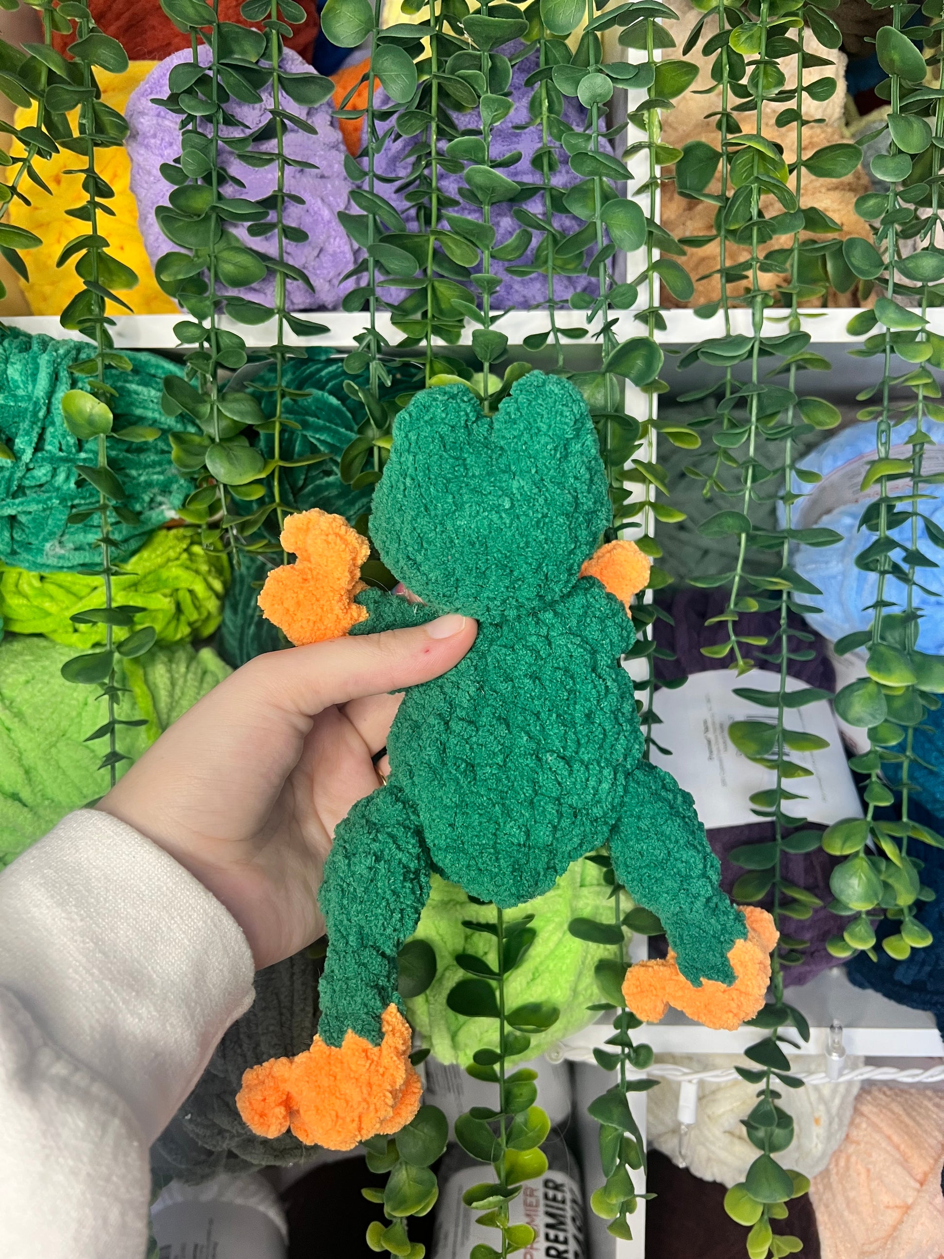 Crocheted baby safe frog snuggler. Handmade with yarn, stuffing, and safety eyes. About 8.5 inches tall. SNUGGLER MEANS THE BODY IS NOT STUFFED. The eyes are embroidered to make it safe for babies.