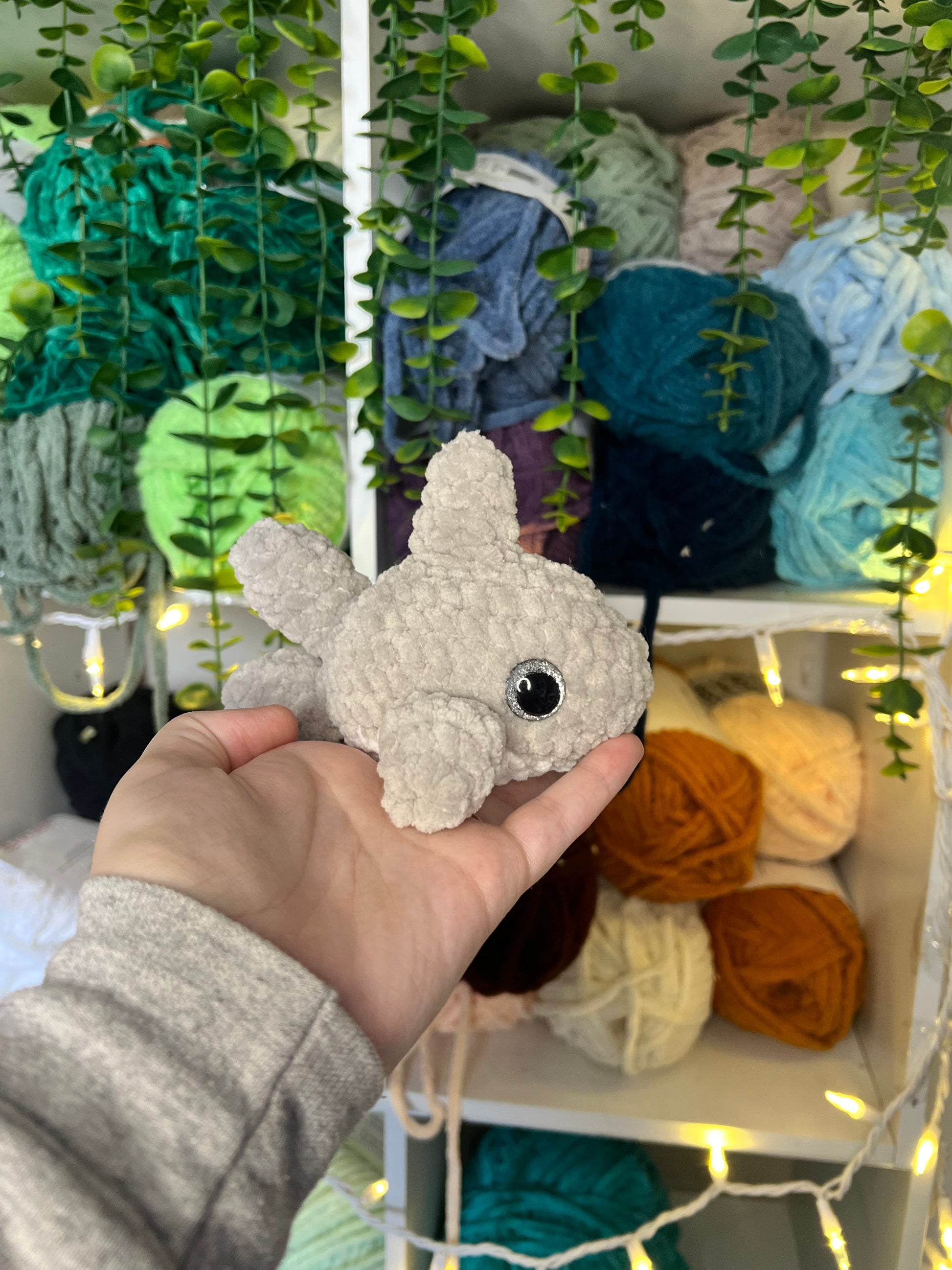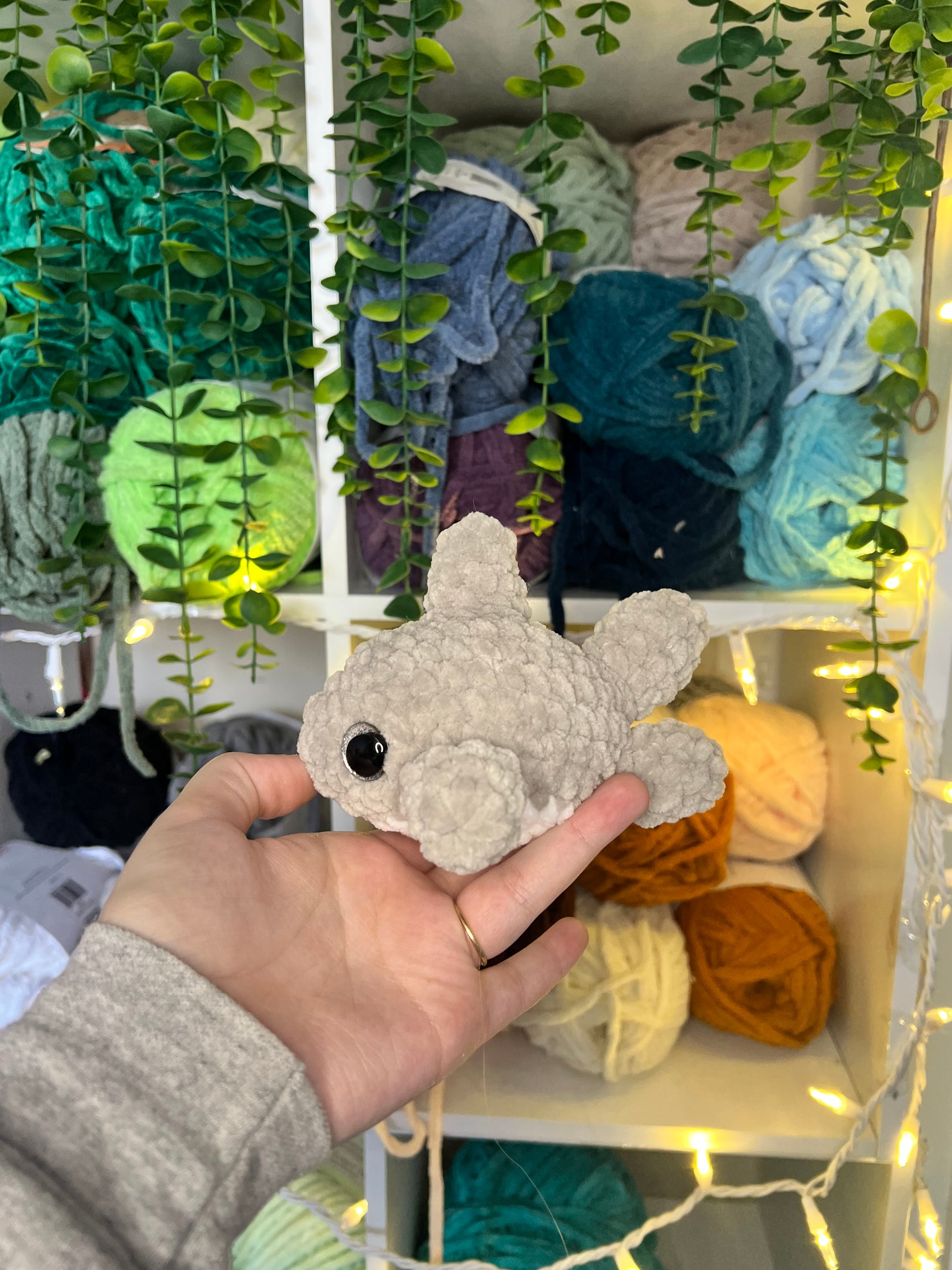 Crocheted baby shark. Handmade with yarn, stuffing and safety eyes. About 6 inches long.