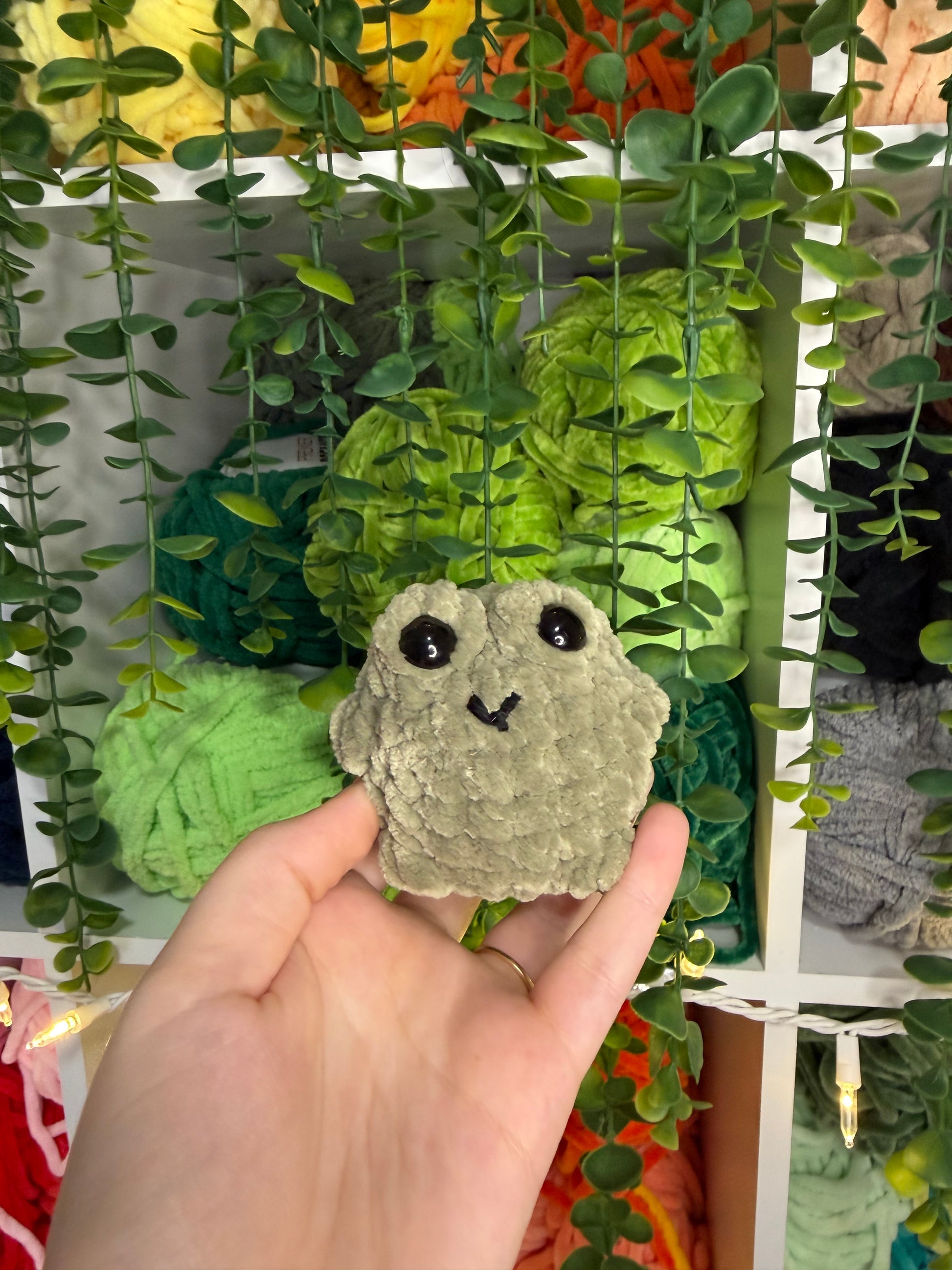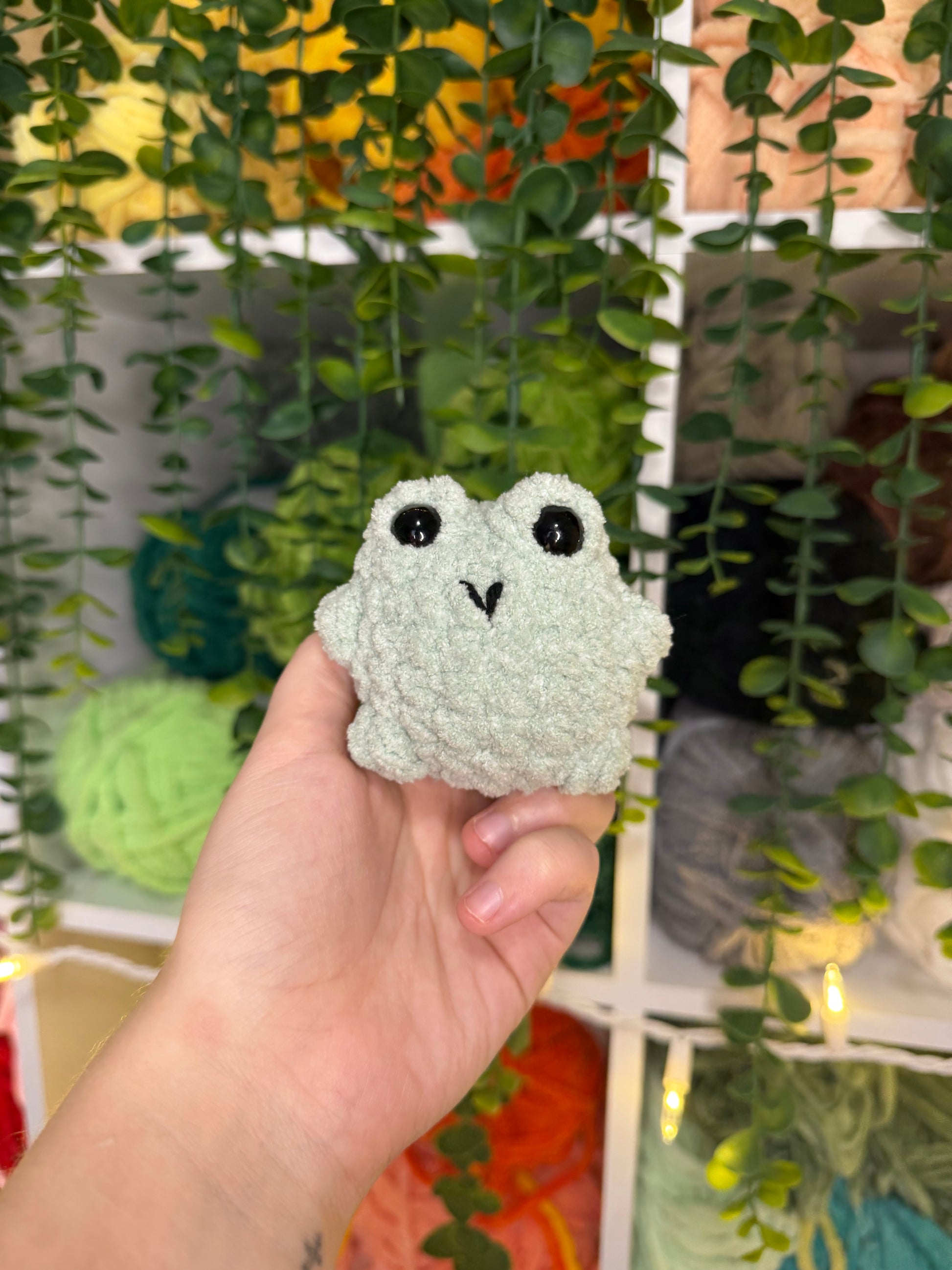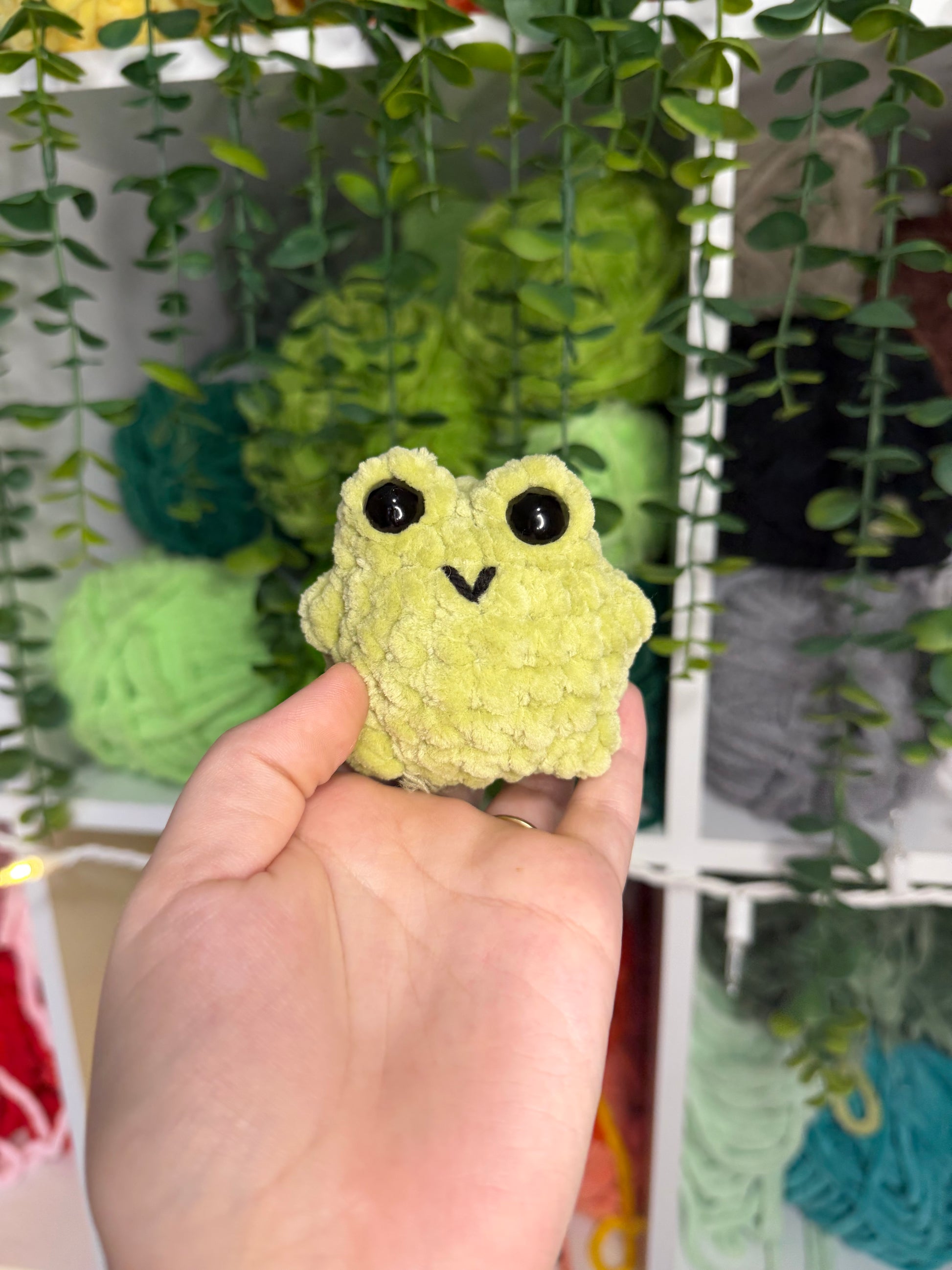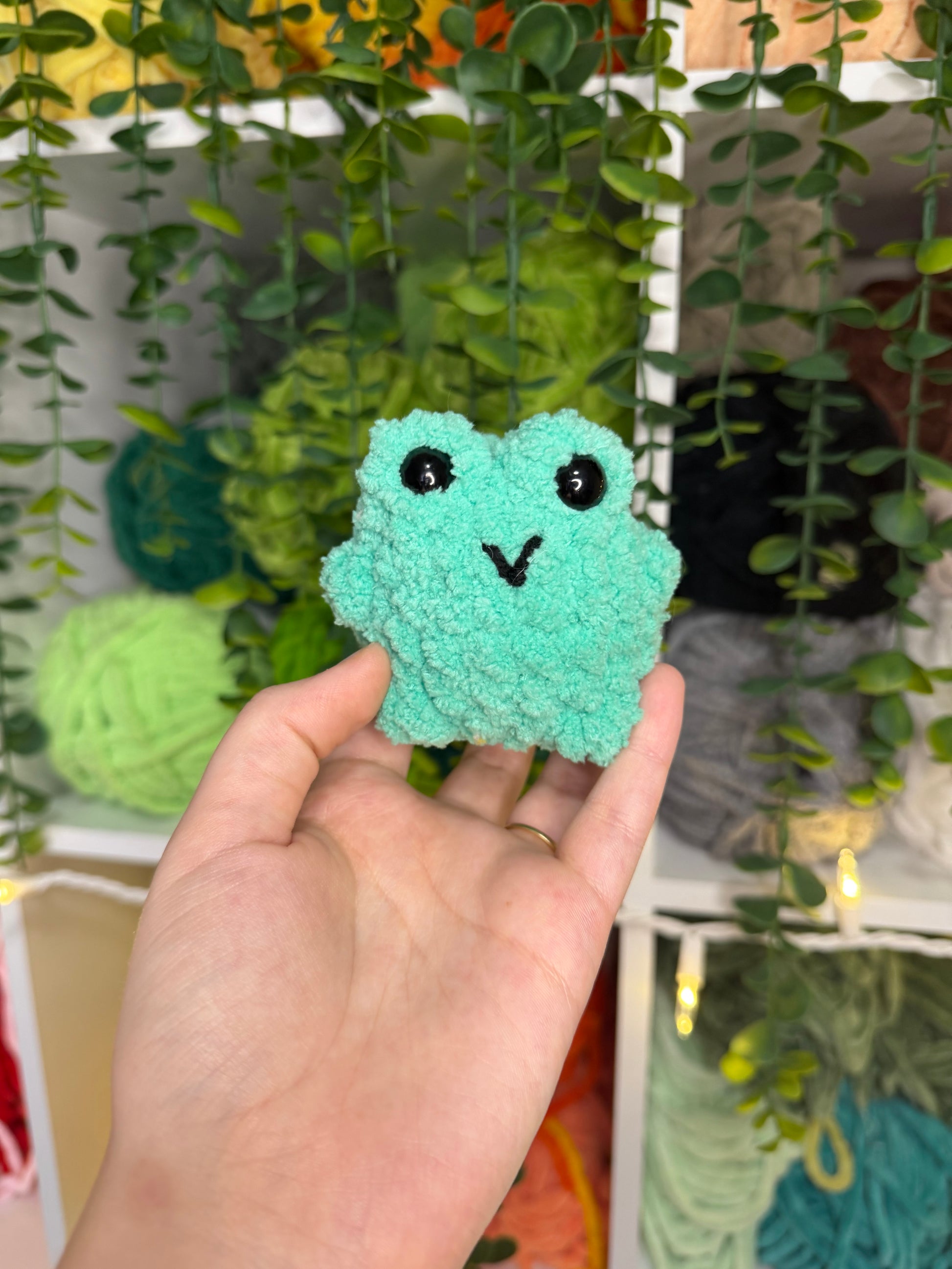 Crocheted chubby frogs. Handmade with yarn, stuffing, and safety eyes. About 3 inches long.