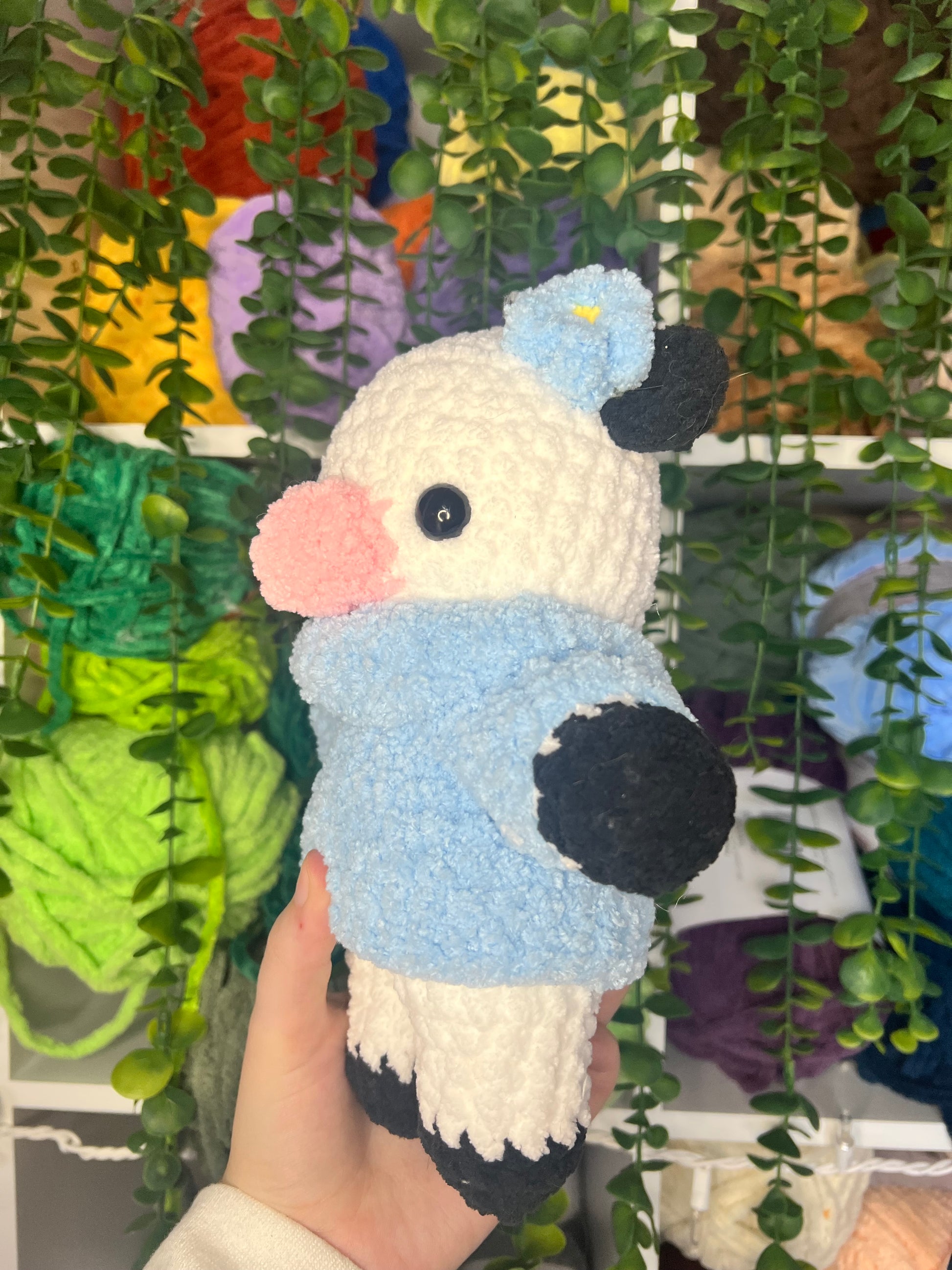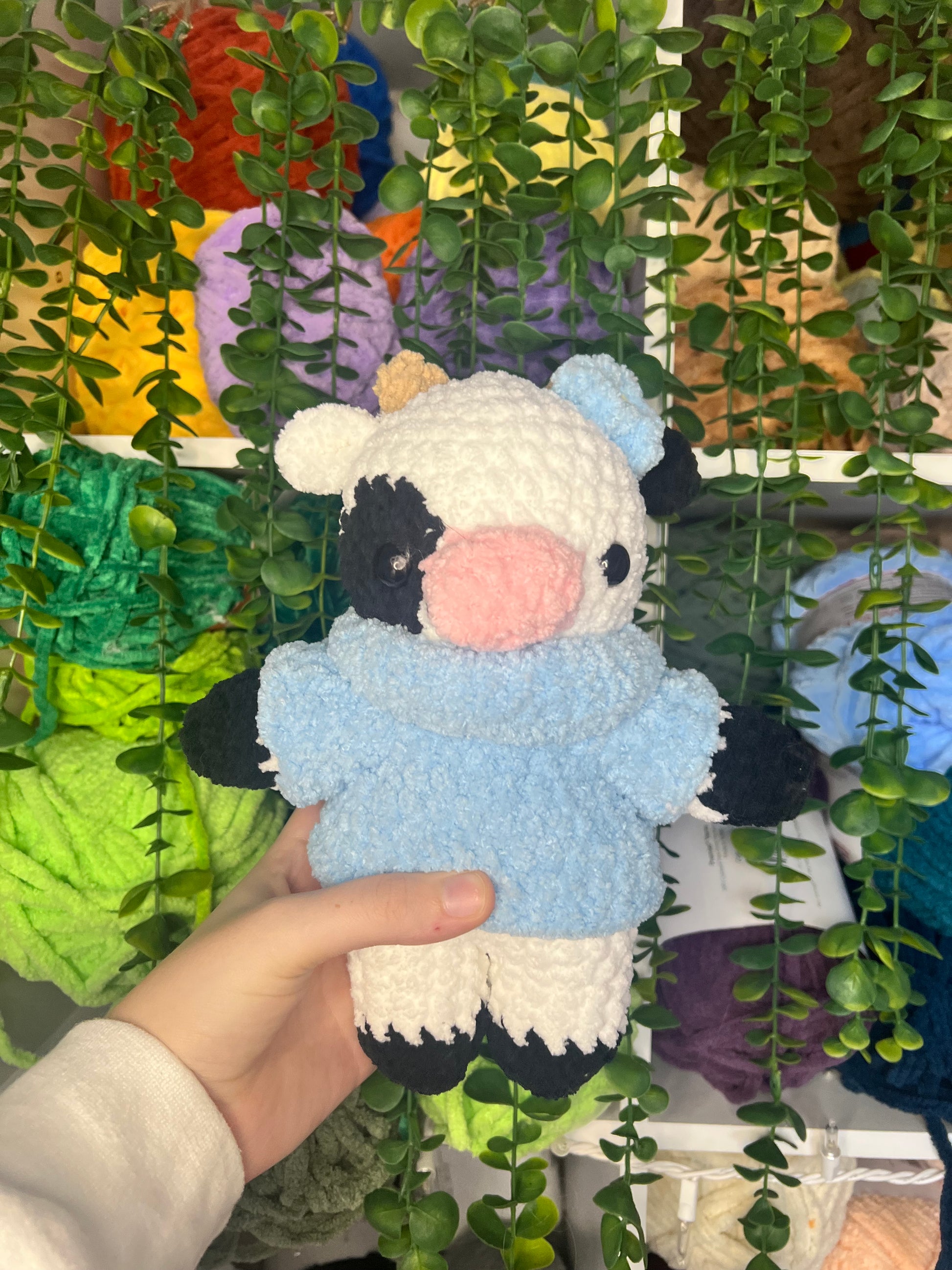 Crocheted cow in a sweater. Handmade with yarn, stuffing, and safety eyes. About 9.5 inches tall.