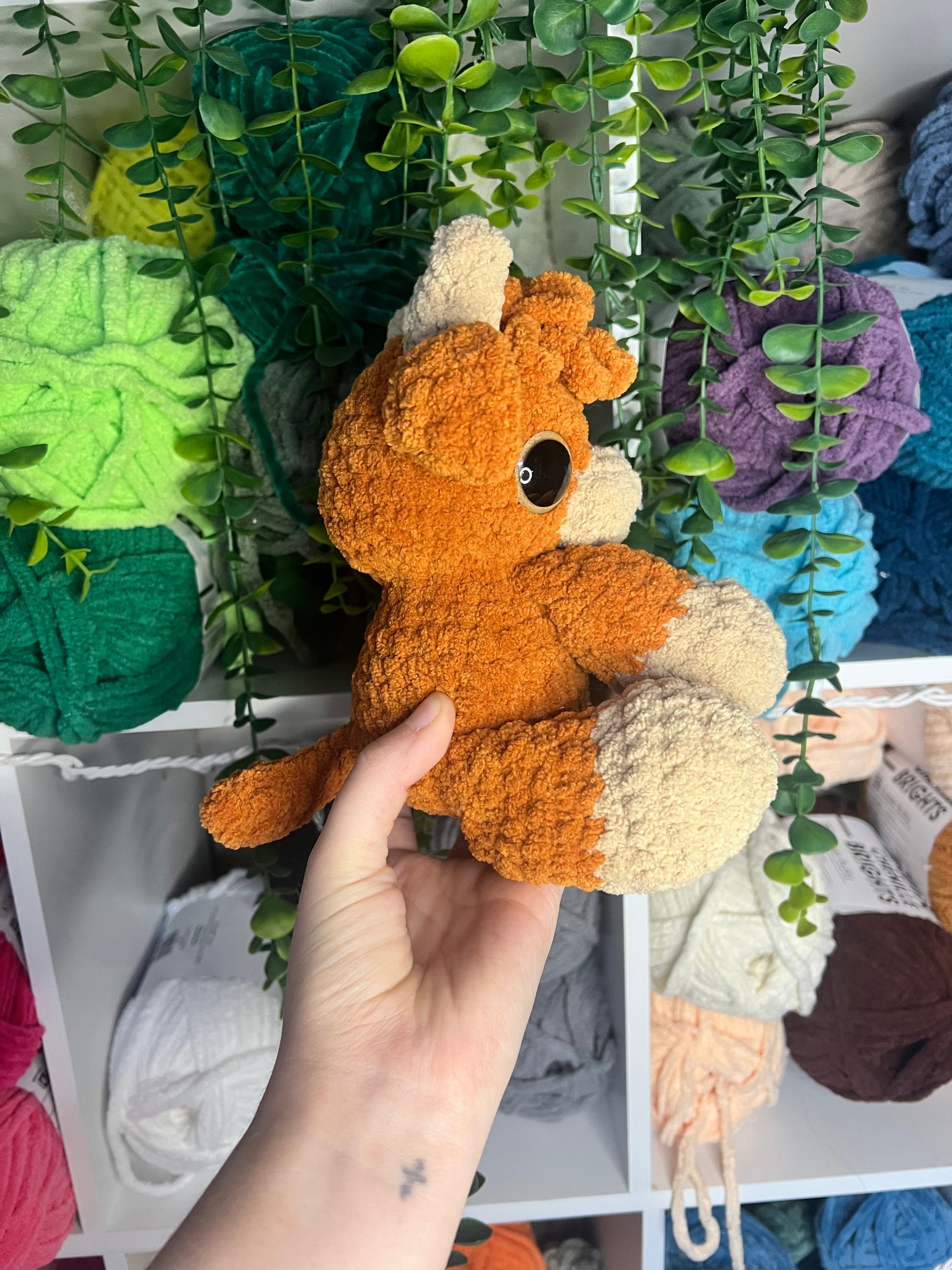 Crocheted highland cow. Handmade with yarn, stuffing, and safety eyes. About 7 inches tall.