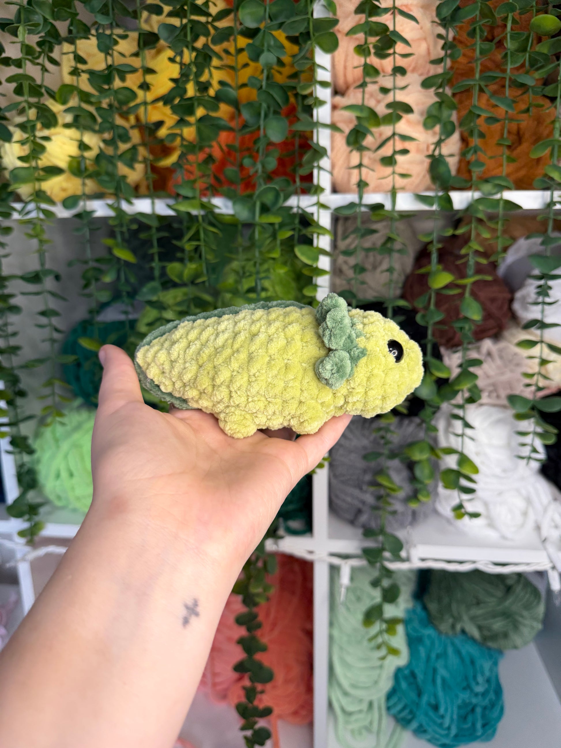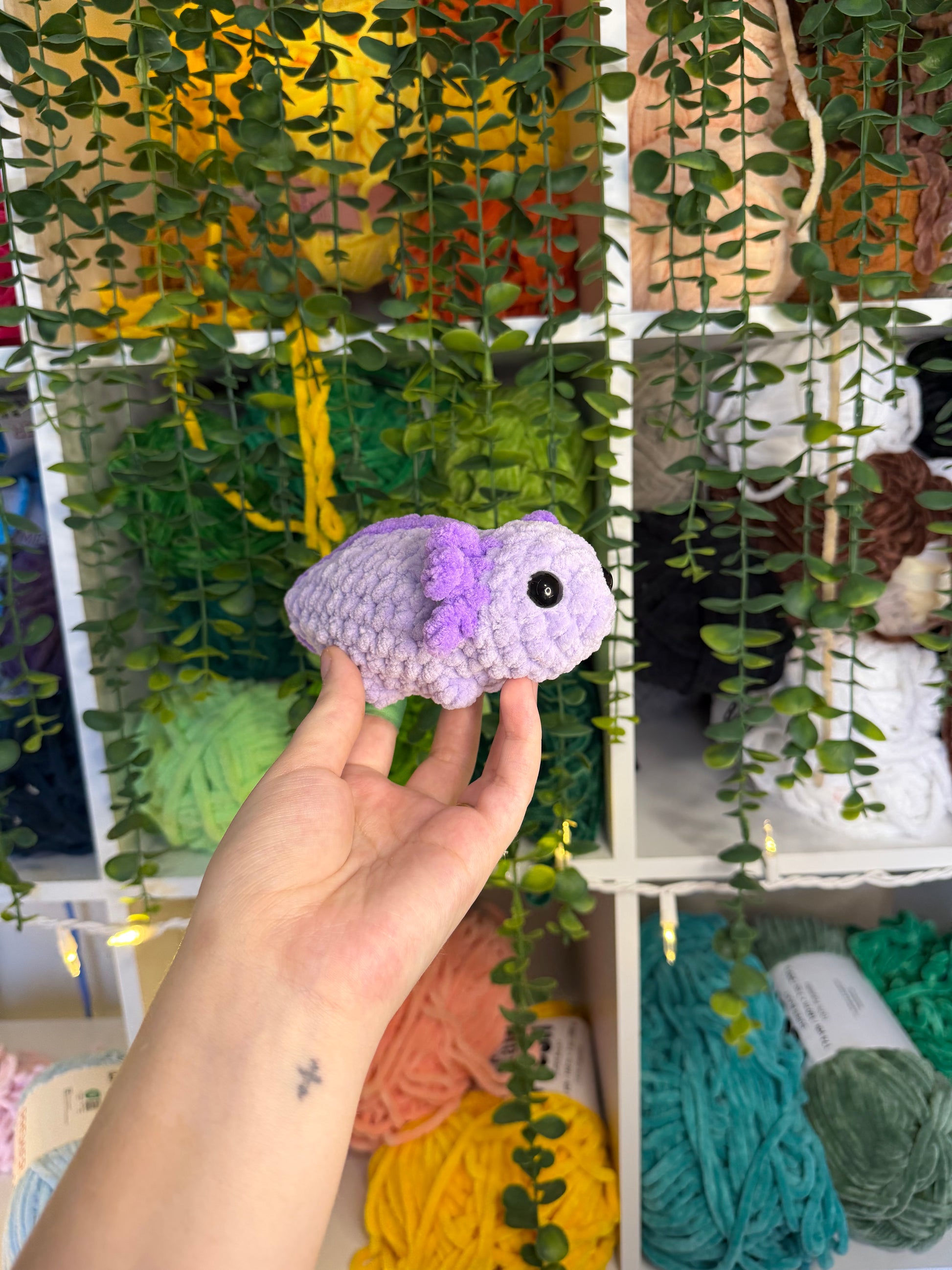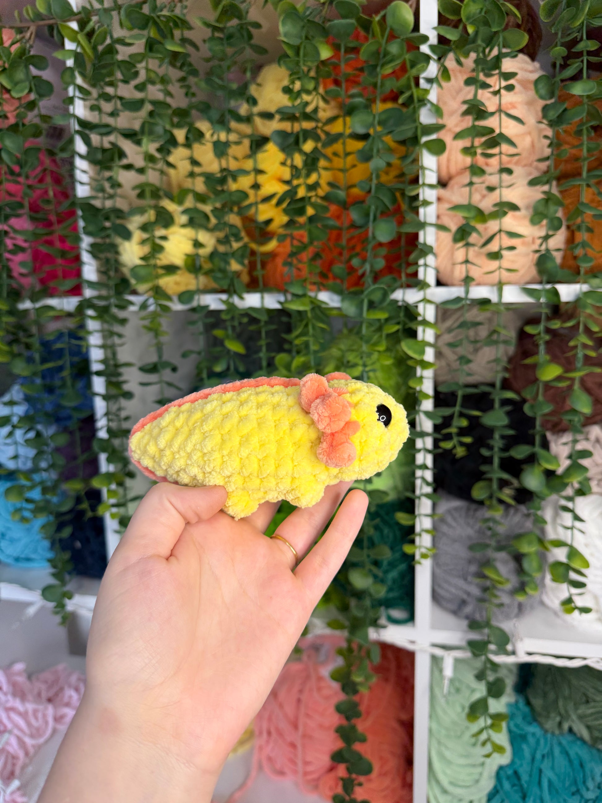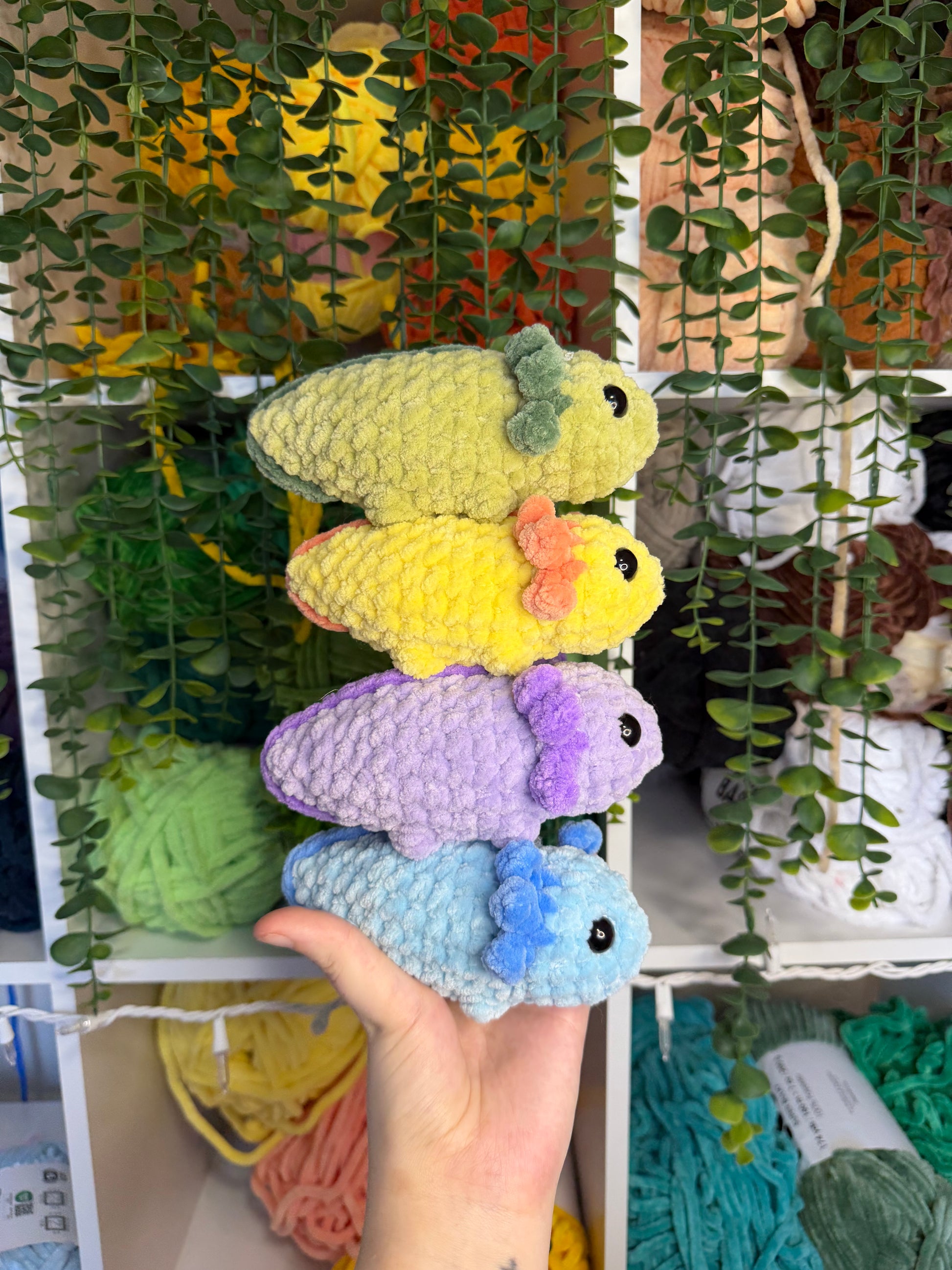 Crocheted mini axolotls. Handmade with yarn, stuffing, and safety eyes. About 6 inches long.