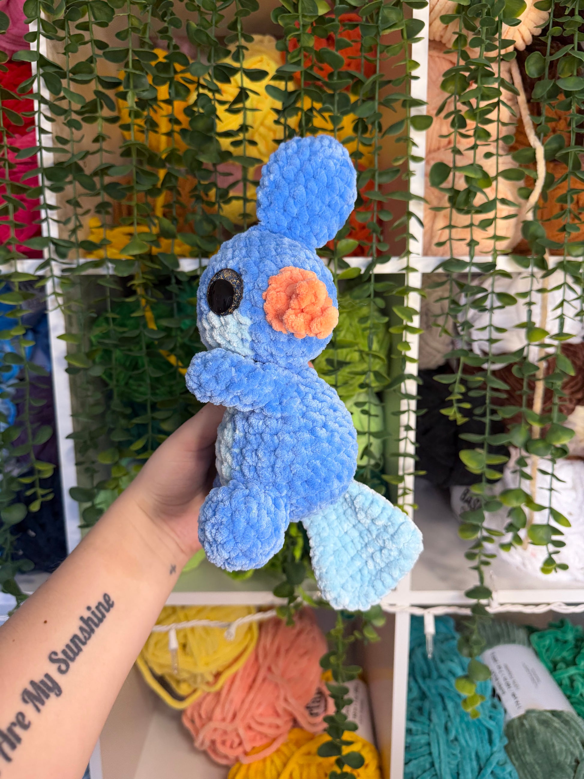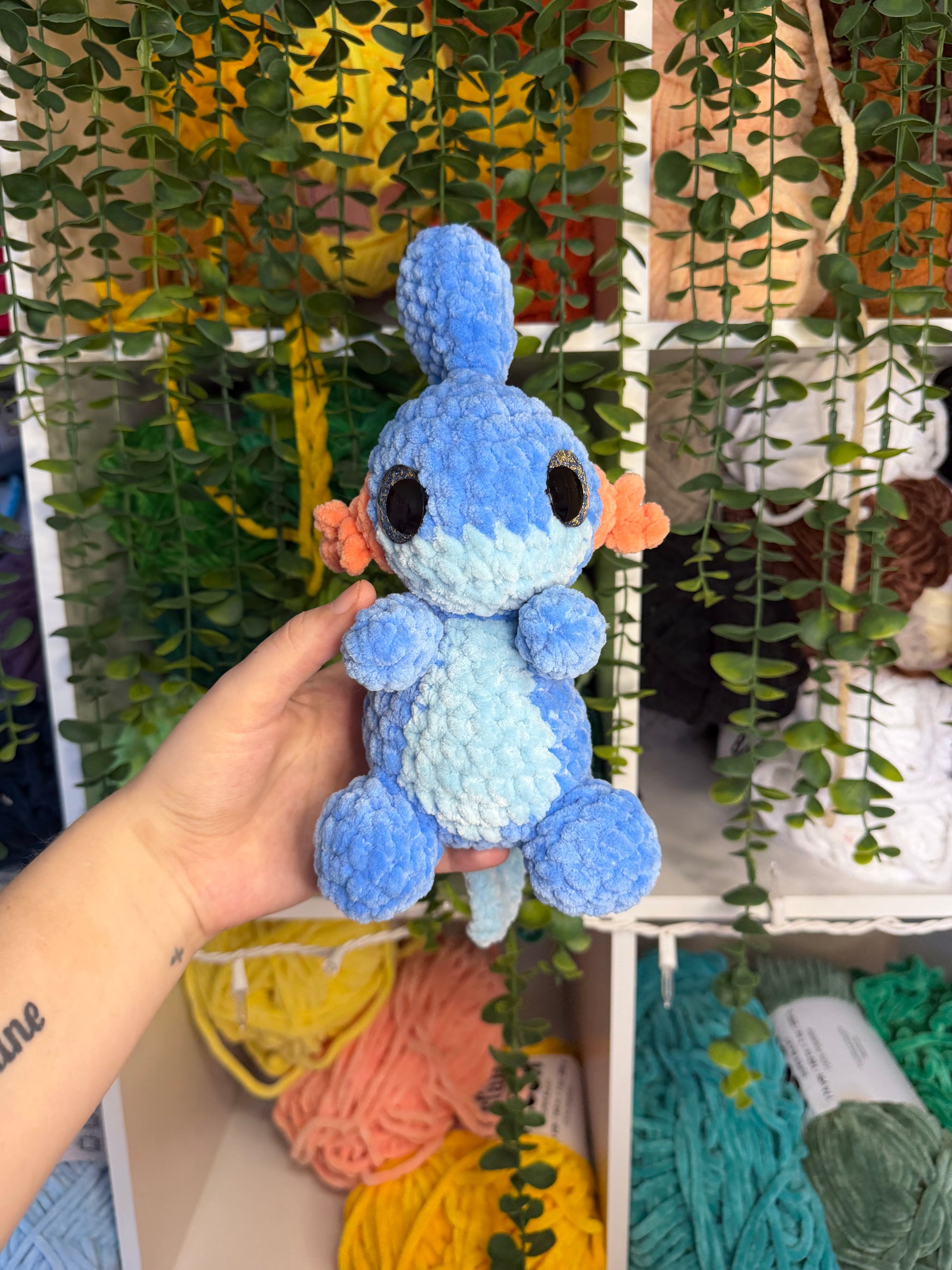 Crocheted mud fish. Handmade with yarn, stuffing, and safety eyes. About 10 inches tall.