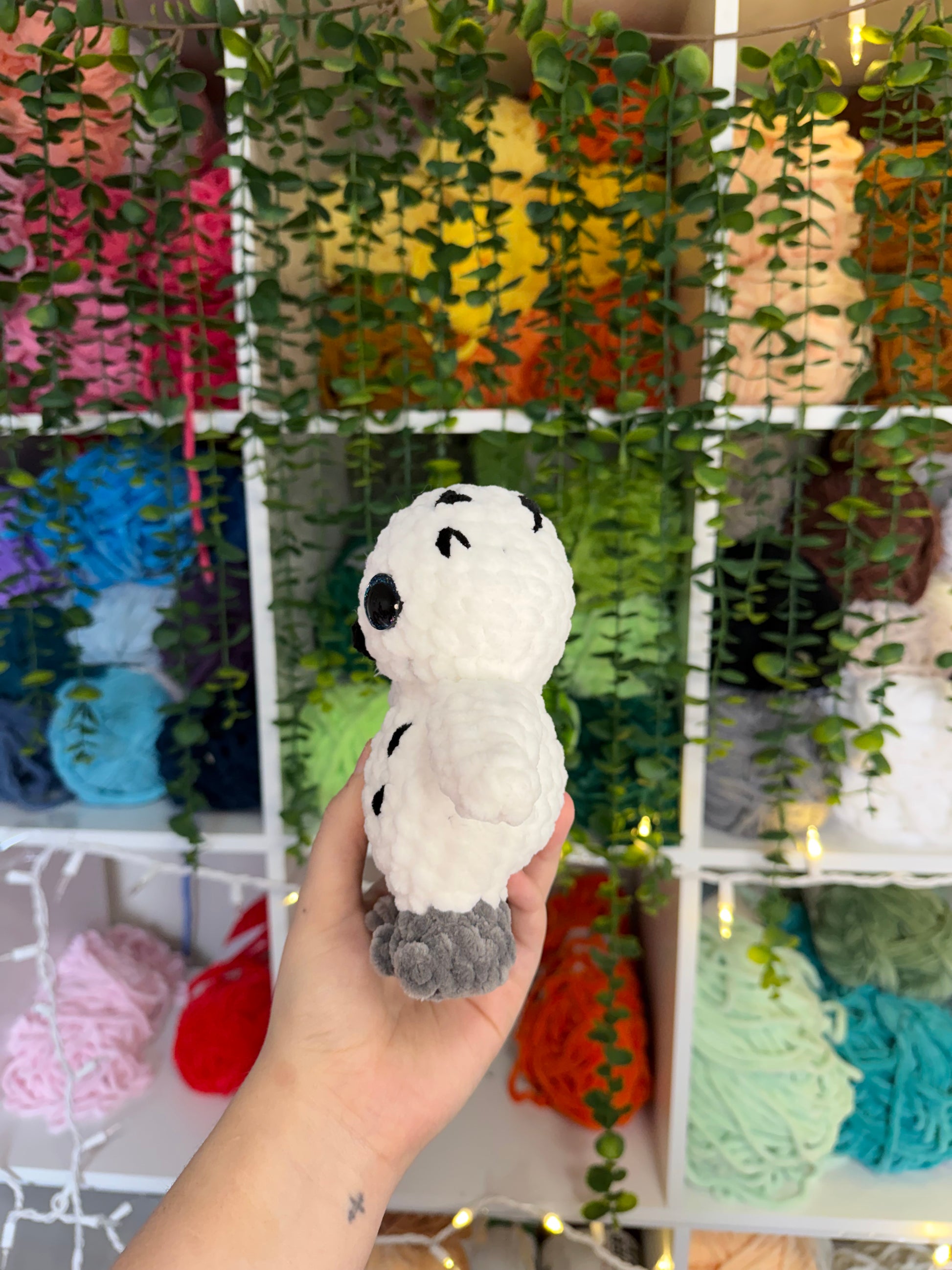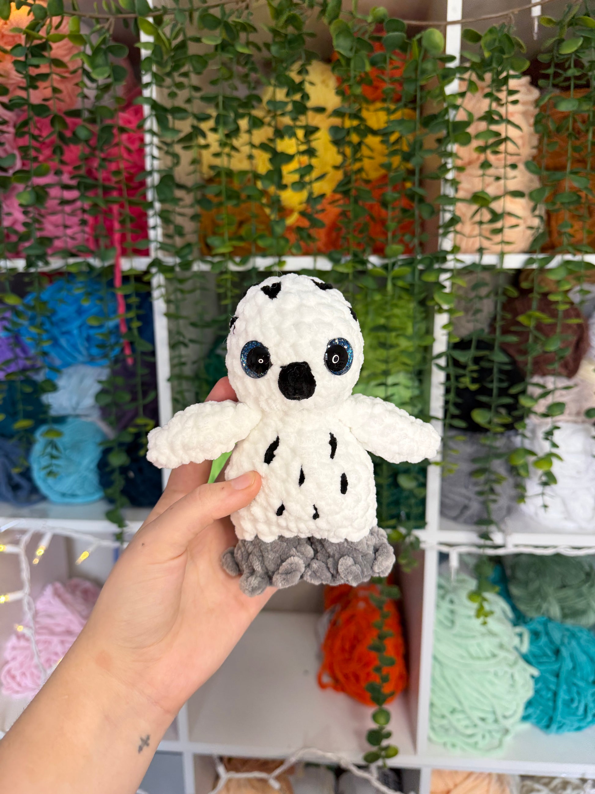 Crocheted owl. Handmade with yarn, stuffing, and safety eyes. About 6 inches tall.