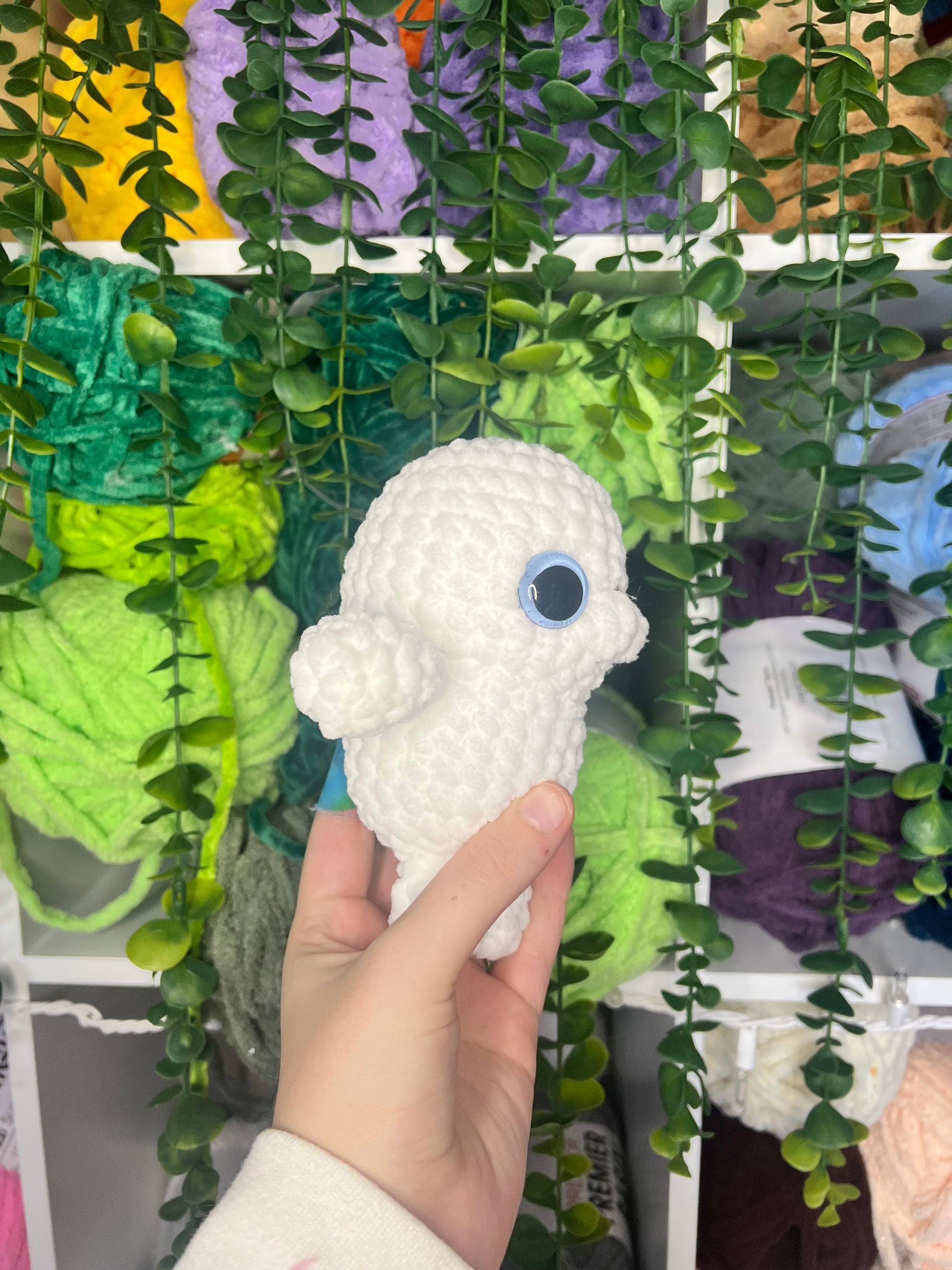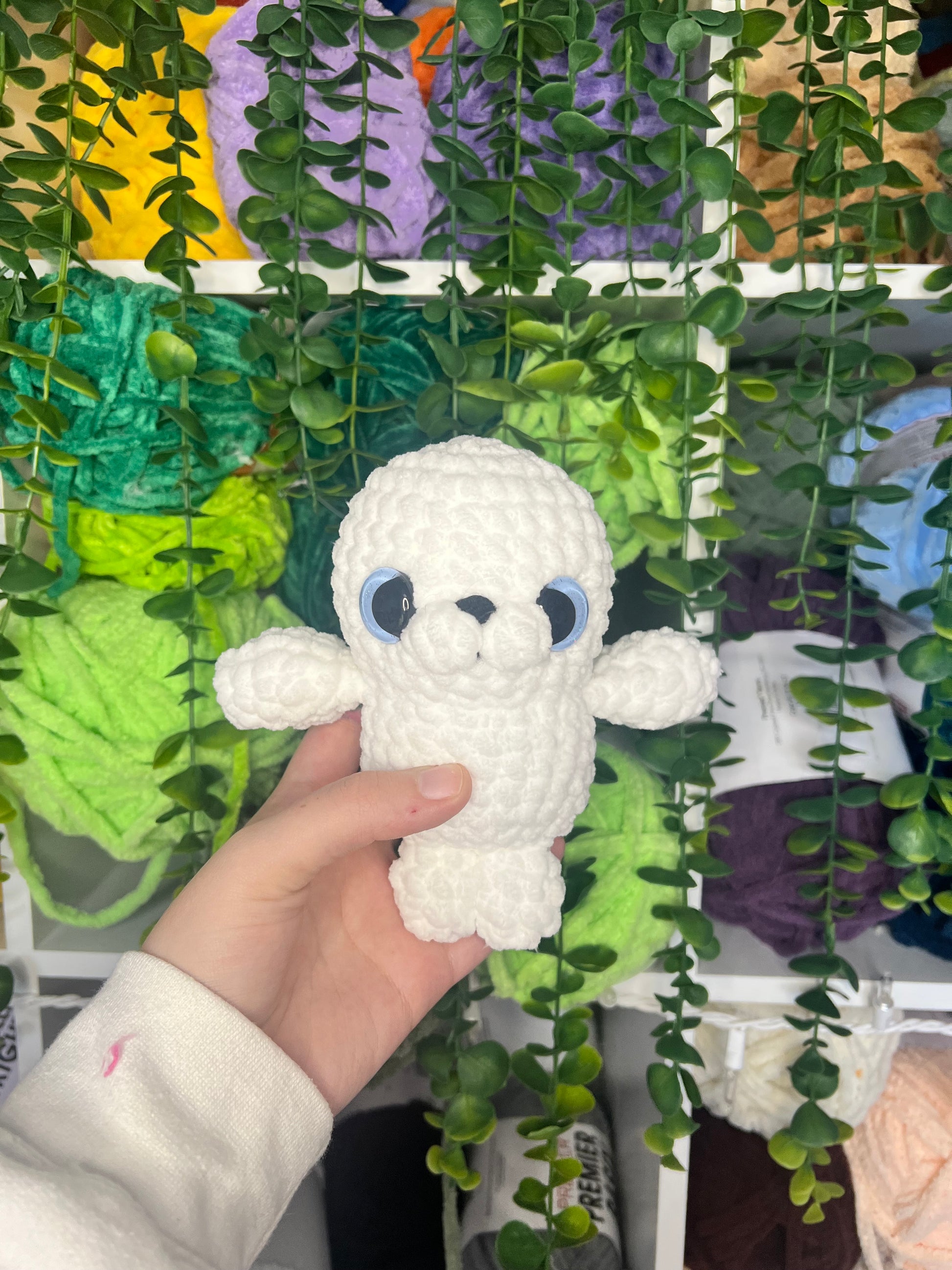 Crocheted seal. Handmade with yarn, stuffing, and safety eyes. About 6 inches tall.