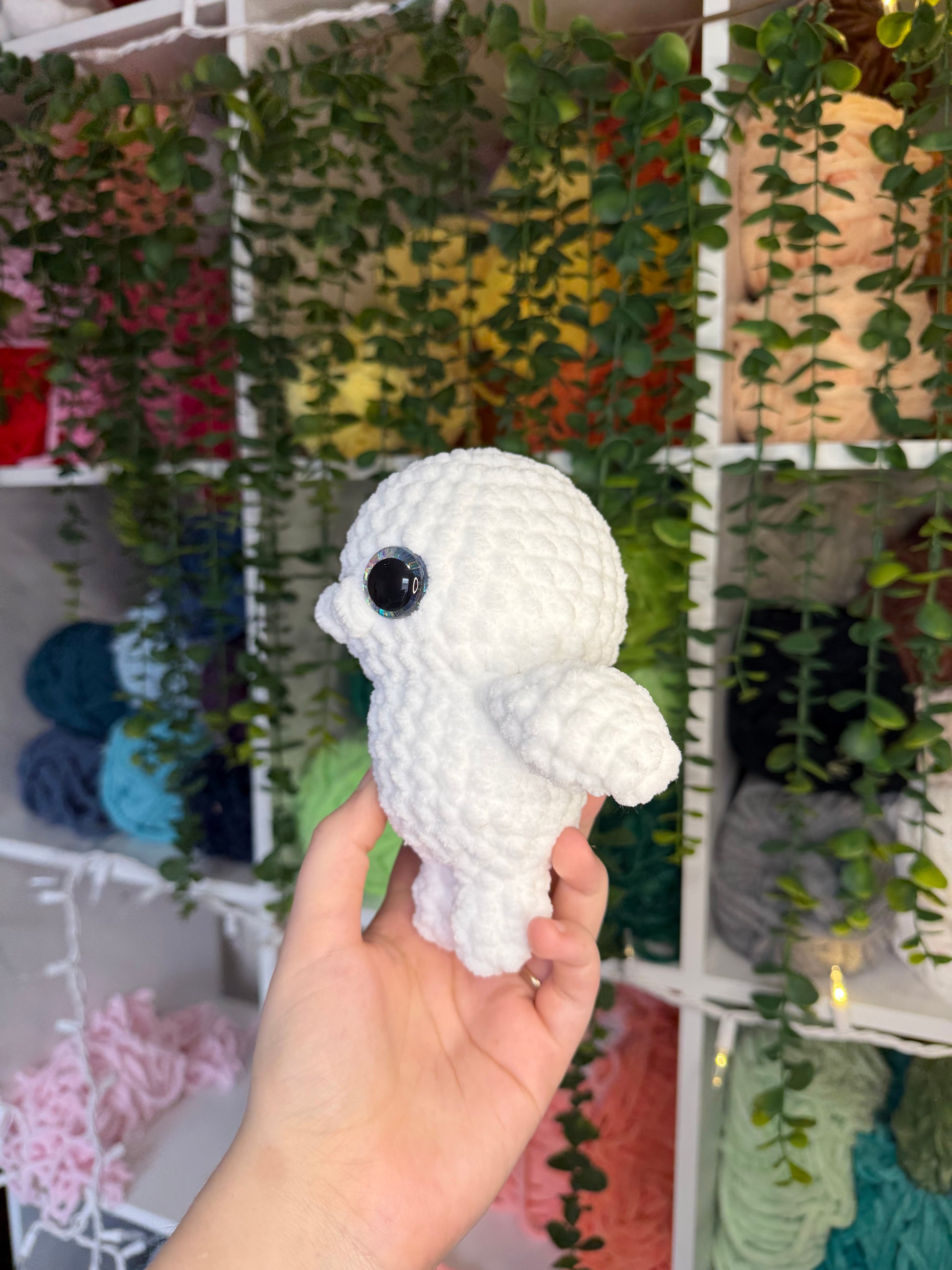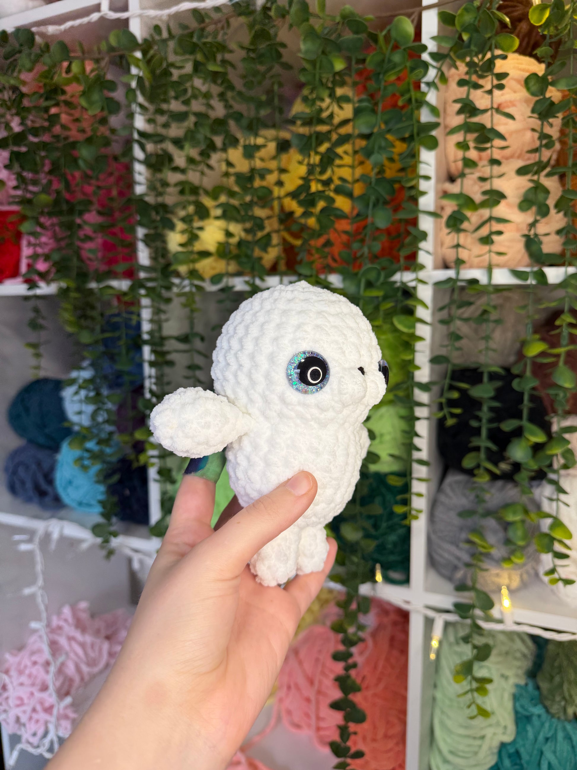 Crocheted seal. Handmade with yarn, stuffing, and safety eyes. About 6.5 inches tall.