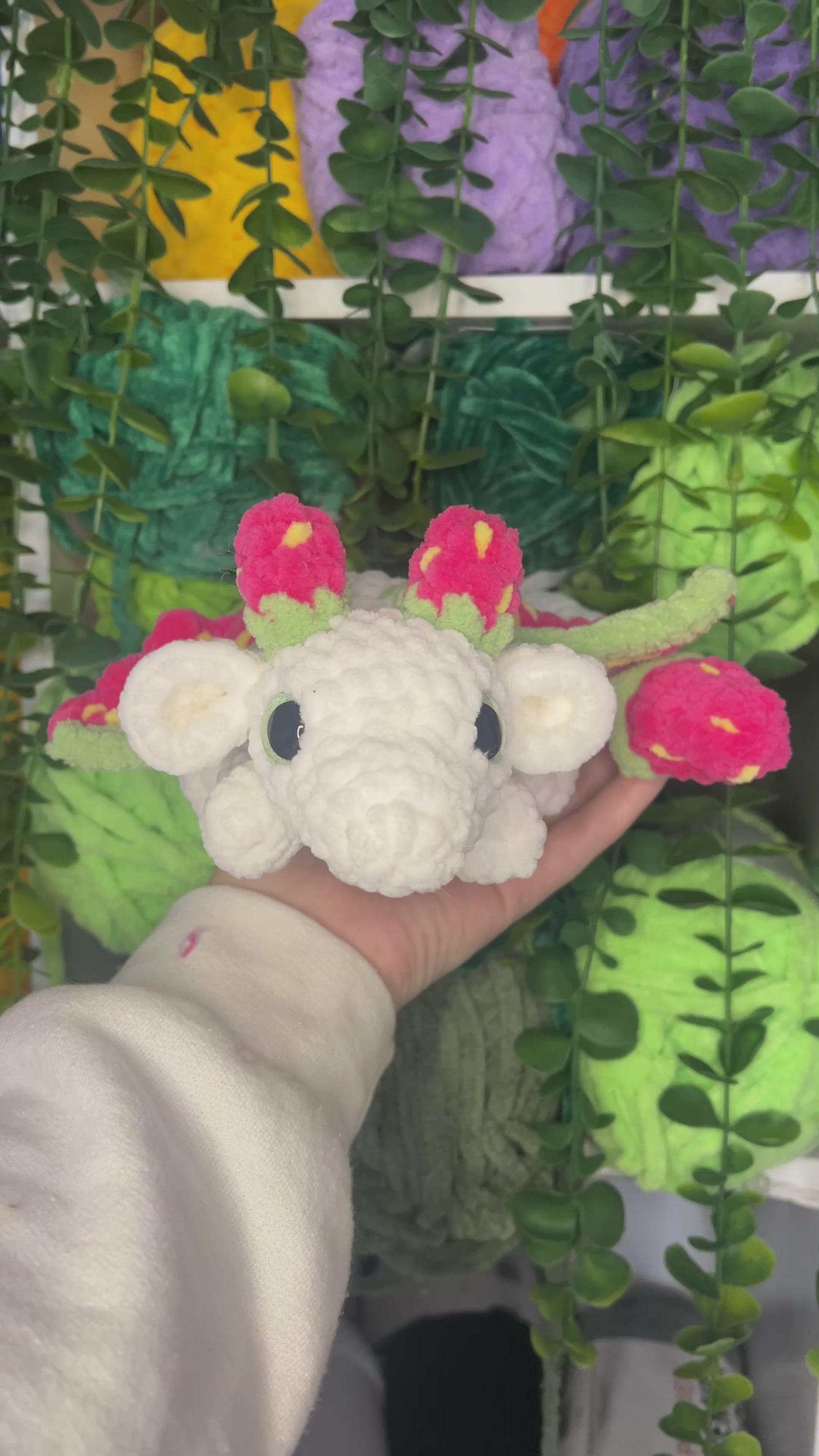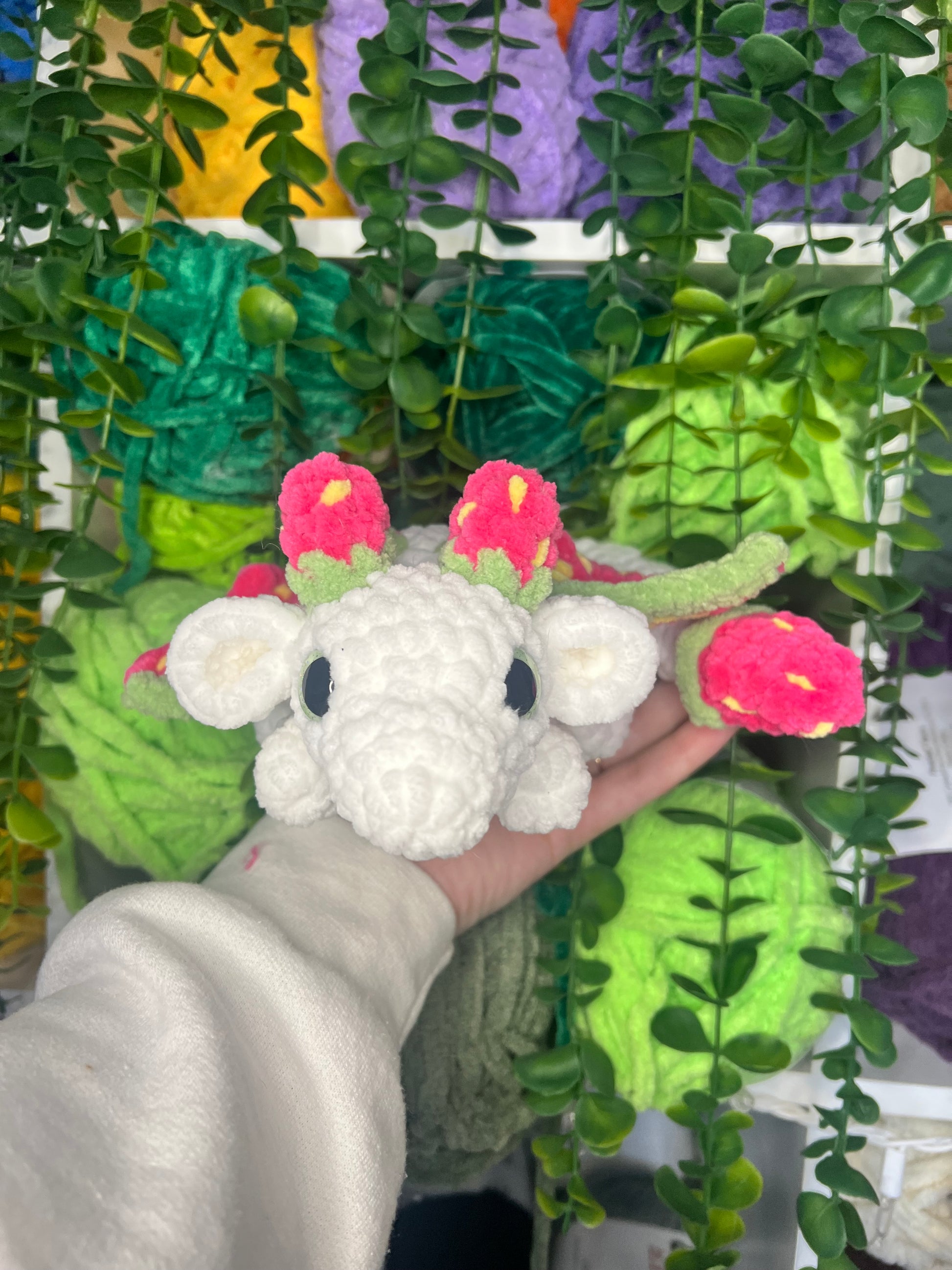Crocheted strawberry dragon. Handmade with yarn, stuffing, and safety eyes. About 14 inches long.