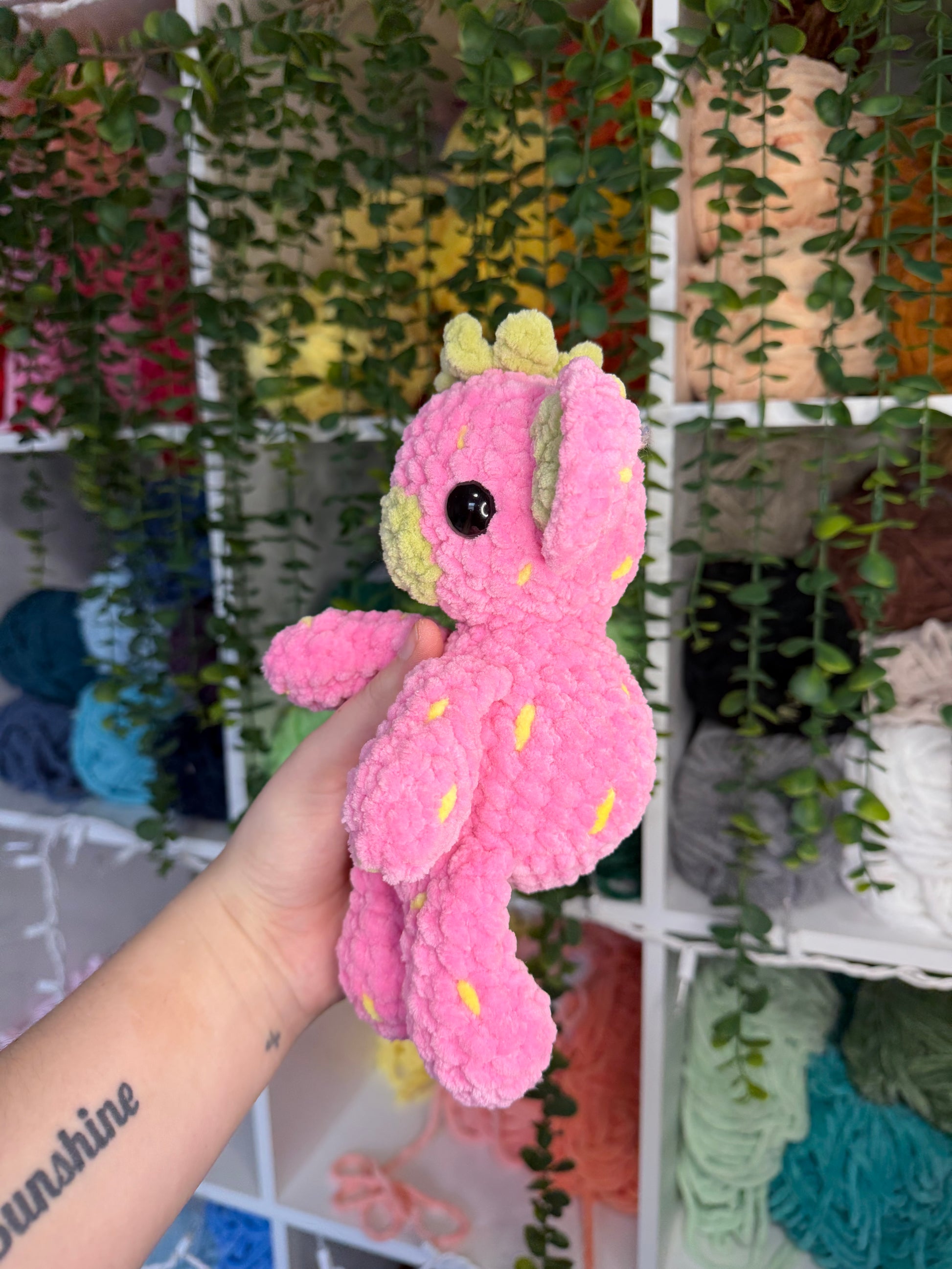 Crocheted strawberry koala. Handmade with yarn, stuffing, and safety eyes. About 9 inches tall.